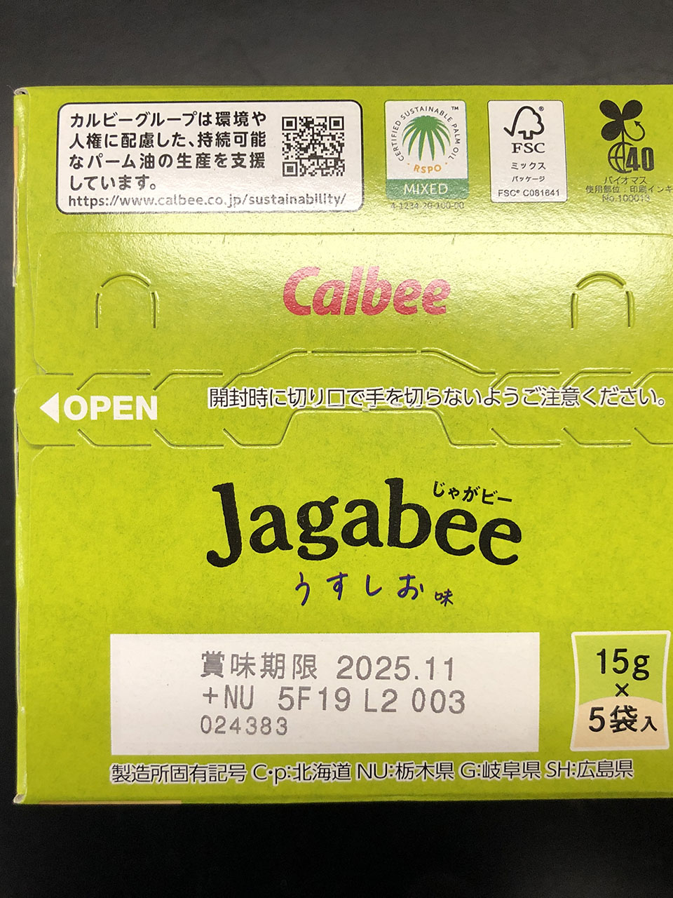 カルビー(株) Jagabeeうすしお味 LOT:2025.11 +NU 5F19 L2 003 024383 |