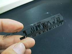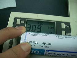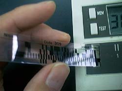 箱からバーコードを取り出します。上の方に書いてあるCode番号を確認します。このバーコードは試験紙が硝酸イオン濃度でどういう色の変化をするのか書いてあるものです(検量線)。ここでは309ですね。 |