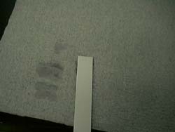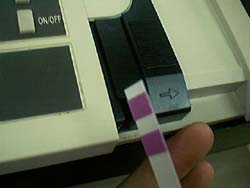 ふたを開けて、素早く試験紙を取り出します。先に反応部分が2箇所ついていますのでソコにはさわらないようにします。 |