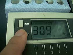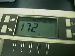 測定値が出ます。画面では172ppmと表示されていることになります。数字は記録用紙に書いておきます。RQフレックスはデータを記憶していますのであとからMEMボタンで呼び出すことも出来ます。 |