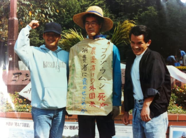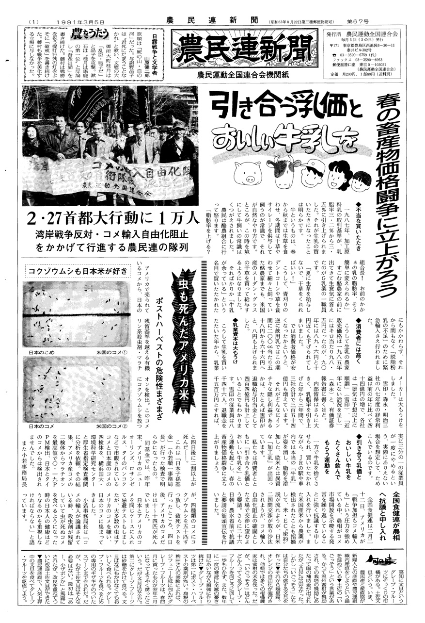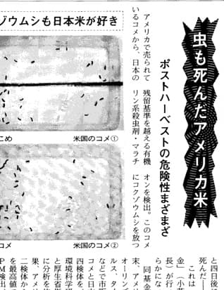 輸入米の安全性について関心が高まる中、農民連新聞(現、農民運動全国連合会機関誌の新聞農民)の1991年3月5日号の記事には、日本子孫基金(現、食品と暮らしの安全)さんらが、アメリカで販売されている米について、横浜国立大学・環境課化学研究センターと厚生省指定検査機関(おそらく日本食品分析センターではないか)に、残留農薬検査を依頼し、アメリカ産の米から有機リン系のマラチオンが、0.19 ppmで検出したことを報道しています(右写真)。また、日本子孫基金では、この時、タッパーにアメリカ産米をいれ、コクゾウムシを放ち、その生存数や忌避行動を確かめるという実験も行っていて、4日後には、2割が死亡したという報告は話題となりました。
